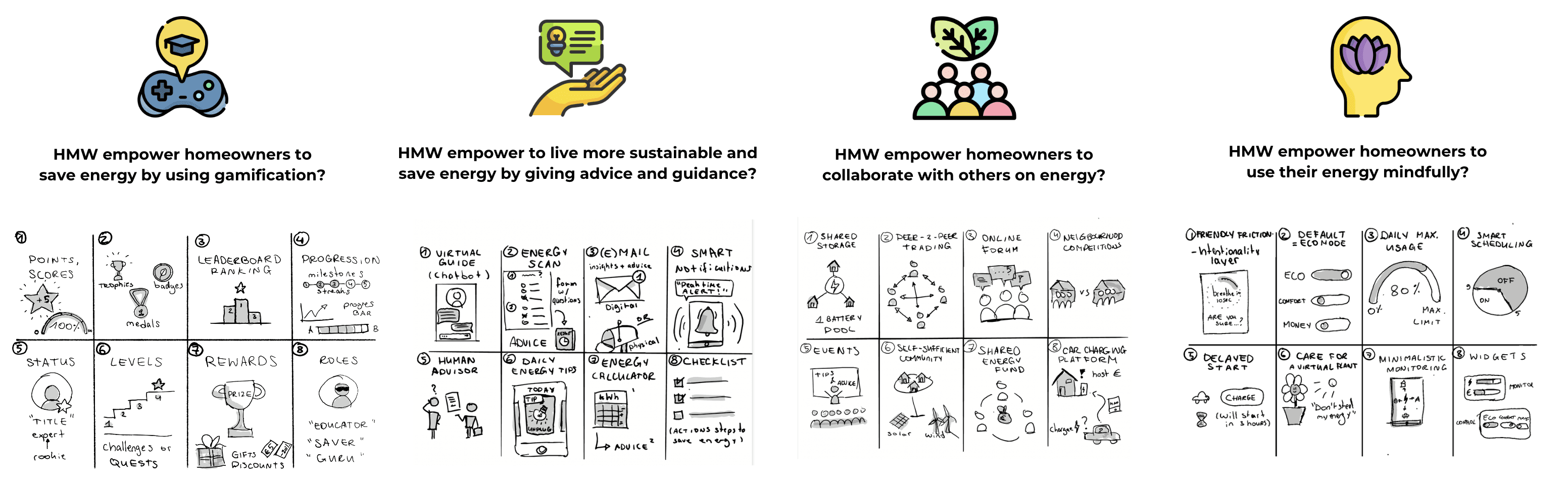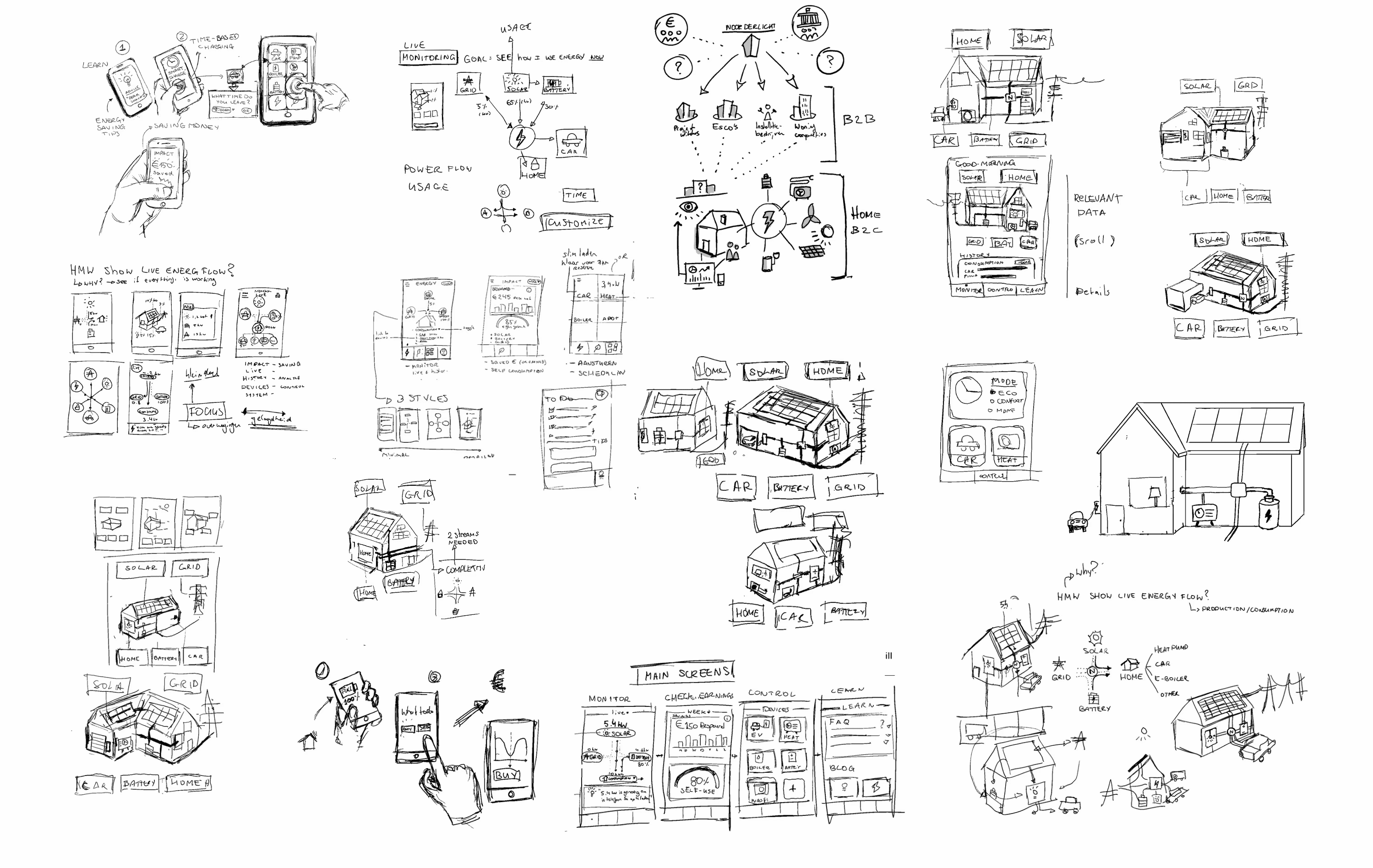 Using 'How Might We' questions, Crazy Eights, and Explorative Sketching, I thoroughly explored the design space to discover creative solutions for home energy management.